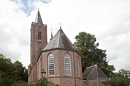 Lees het bordje bij de hoofdingang van de kerk (onder de toren).